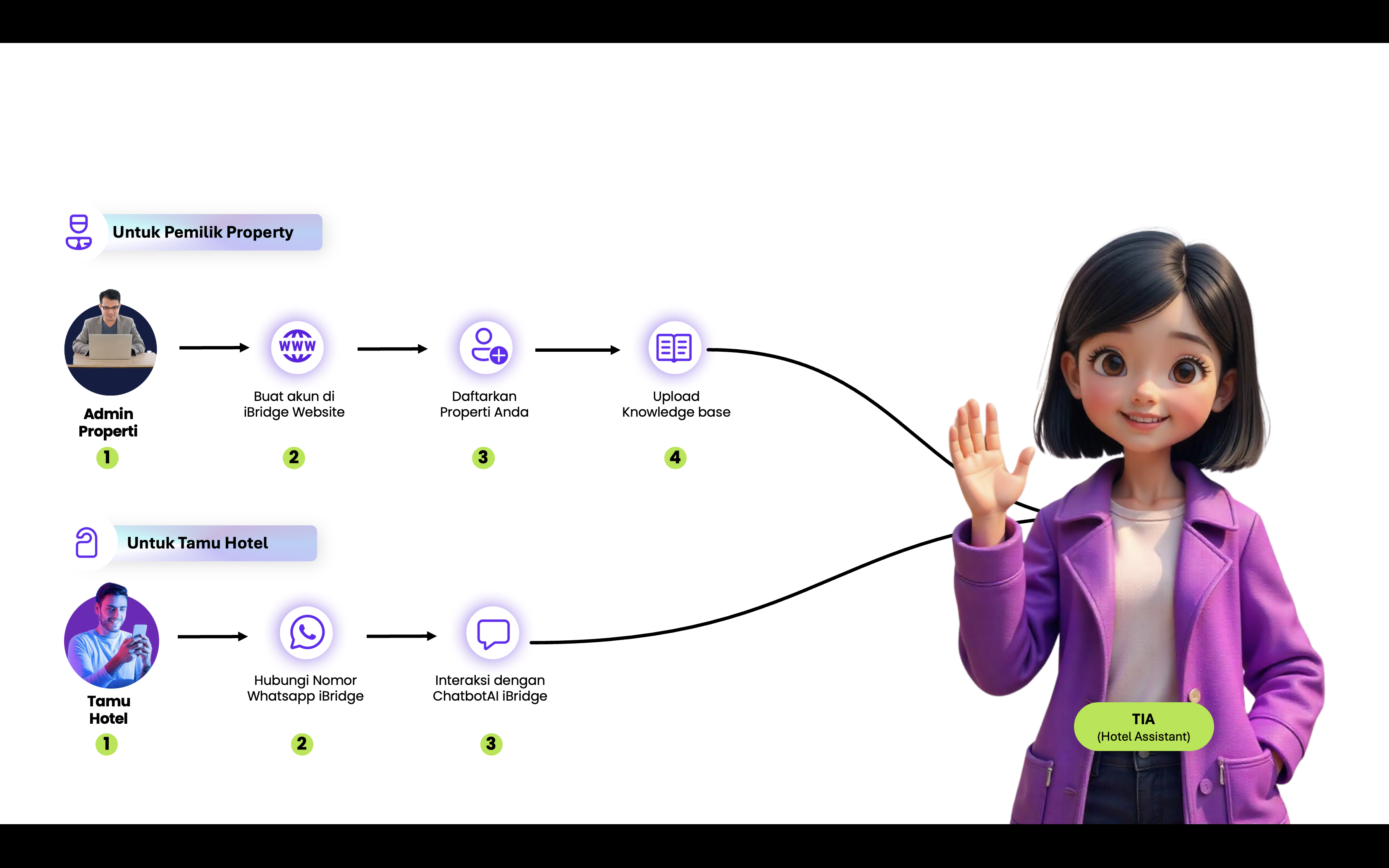 iBridge adalah platform Asisten AI yang mengubah cara tamu berinteraksi dengan hotel, serta membantu pemilik properti mengelola bisnis mereka